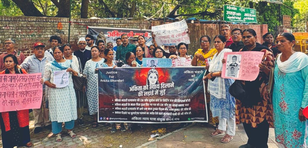 नई दिल्ली/देहरादून। उत्तराखंड के चर्चित अंकिता भंडारी हत्याकांड में पुलिस के चंगुल से दूर दोषियों के खिलाफ कार्रवाई की मांग करते हुए अंकिता भंडारी न्याय यात्रा संयुक्त संघर्ष मंच और दिल्ली में विभिन्न राजनीतिक दलों और जन सरोकारों से जुड़े संगठनों के प्रतिनिधियों ने रविवार को दिल्ली के जंतर मंतर पर प्रदर्शन किया। प्रदर्शन के दौरान। अंकिता भंडारी को न्याय दिए जाने के साथ ही मर्डर केस में शामिल दोषियों की गिरफ्तारी की मांग उठाई।